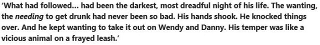 This book is so much more than a haunted house story. The tension builds slowly, allowing the reader to get to know the family. Believe it or not, it’s easy to like them all thanks to the writer’s ability to draw sympathetic characters. While Danny can read people’s minds, King lets the reader under their skin, the close third person narrative drawing us effortlessly into their thoughts.